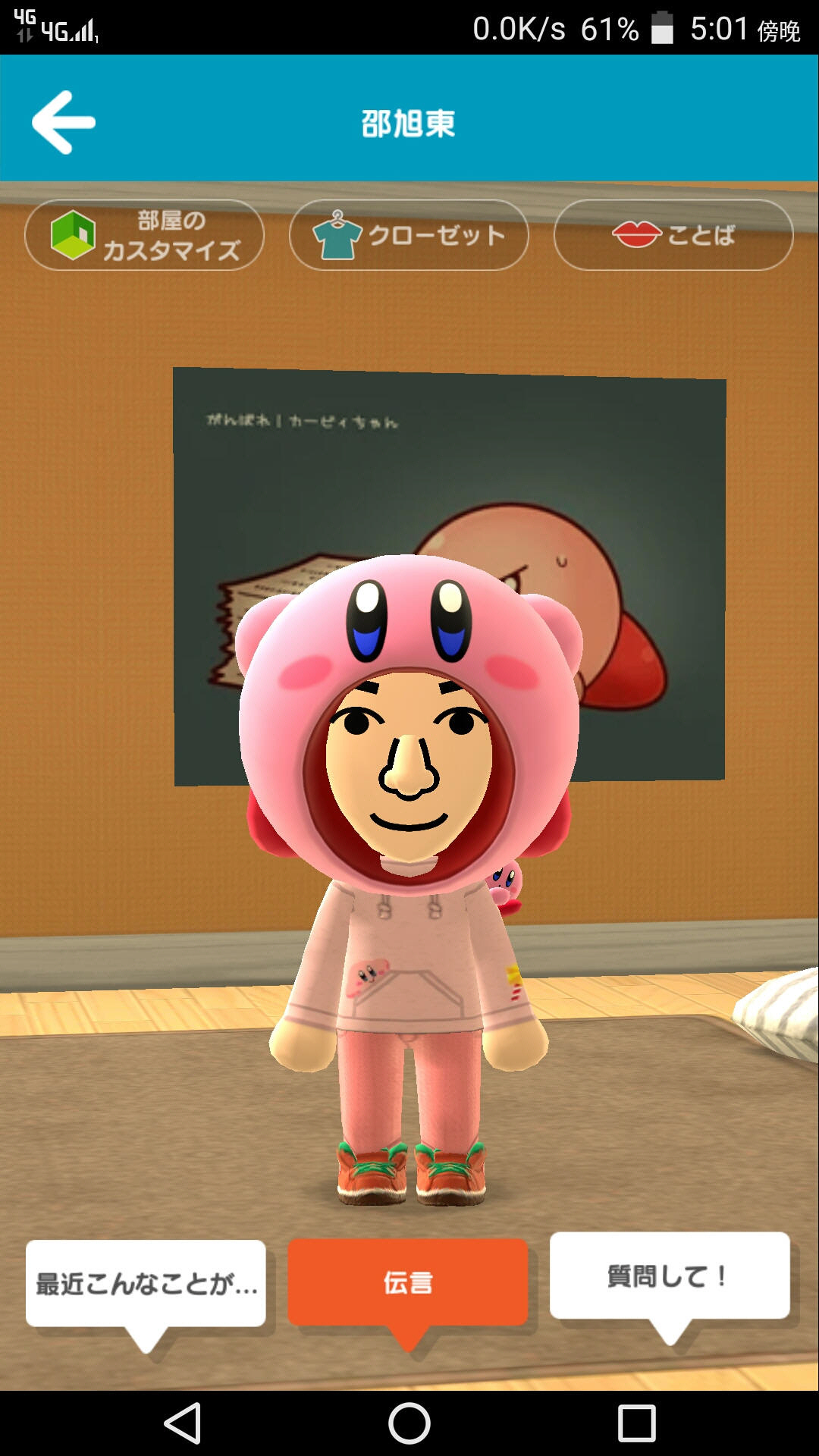 又在2016年,和这位同胞认识了Miitomo的游戏,然后又告诉我这游戏可以搞卡比装扮了!