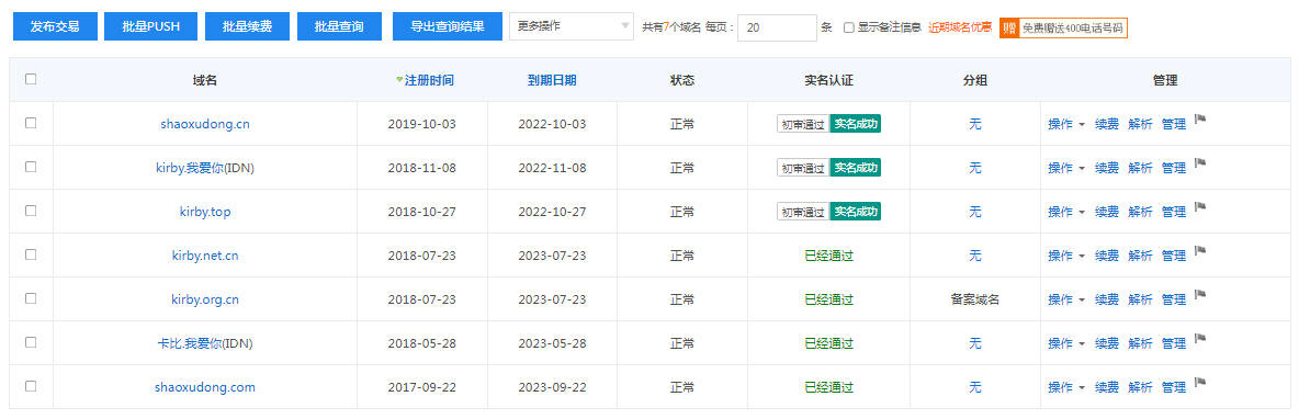 ……但由于工信部在2019年4月22日要求每个非盈利个人网站只能用1个域名的时候,我就考虑只用kirby.org.cn这个域名,其他的只作为跳转。